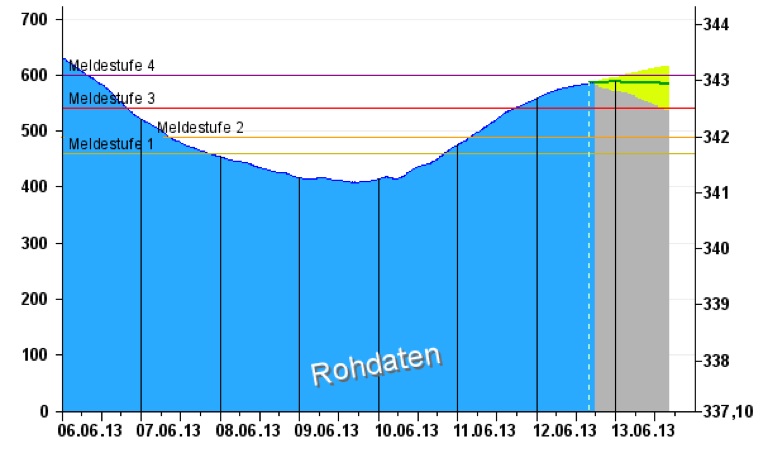 Nach der katastrophalen Flut blickt man freilich besonders aufmerksam auf die Wasserstände. Der Kelheimer Donau-Pegel ist in den vergangenen Tagen schon wieder deutlich angestiegen: von knapp über vier Metern vor drei Tagen auf 5,85 Meter heute um 17.30 Uhr. Inzwischen gilt in Kelheim schon wieder Meldestufe 3. Die Meldestufe 4 (6,00 Meter) werde nicht erreicht, hieß es heute Vormittag aus dem Wasserwirtschaftsamt Landshut noch. Doch nach der aktuellen Prognose des Hochwassernachrichtendienstes (siehe Grafik) sind morgen Pegelstände von über sechs Metern und damit ein Überschreiten der höchsten Meldestufe durchaus möglich. Normal liegt der Pegel der Donau in Kelheim bei 2,90 bis 3,10 Meter. „Wir gehen davon aus, dass die Scheitelwelle wiederum sehr lang gezogen ist, so dass ein merklicher Rückgang des Pegelstandes erst am Freitag erwartet wird“, so das Wasserwirtschaftsamt Landshut heute Vormittag.