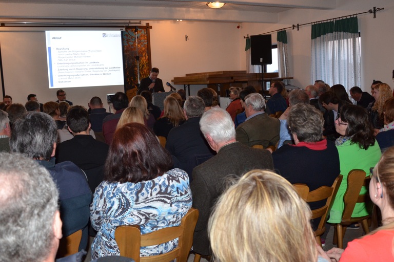 Volles Haus im DJK-Sportheim von Winden – und die Politiker mussten sich von BI-Sprecher Werner Klein einiges anhören.