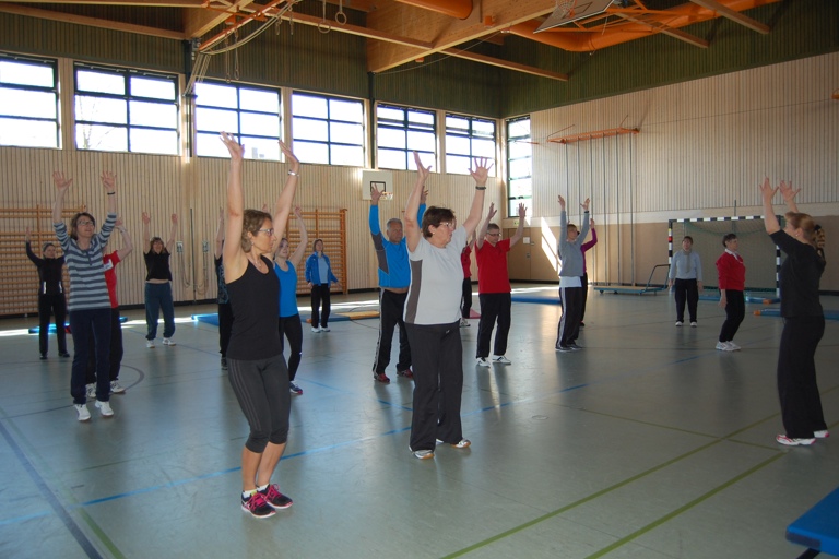 (rry) Die Körpermitte, also der Bereich Hüfte, Becken und Lendenwirbelsäule, stand im Mittelpunkt des zweiten Teils der BLSV-Fortbildungsreihe mit dem Titel „Bodyscan im Verein“ am Wochenende in Reichertshofen. Referentin Eva Braunstorfinger erläuterte den etwa zwei Dutzend Übungsleitern in der Schulturnhalle, wie man mit gezielten Übungen ein „dynamisches Gleichgewicht“ erlangt. Nach einer kurzen Einführung in die Anatomie und Biomechanik des menschlichen Bewegungsapparats und einer peppigen Aufwärmrunde ging die Fitness-Expertin detailliert auf mögliche Trainingsformen ein, mit denen die Übungsleiter in ihren jeweiligen Sportstunden arbeiten können. Die hierbei gestreiften Themen beschäftigten sich unter anderem mit einer aktiven Gelenkpflege für die Hüfte, Kapsellockerung und Muskeldehnung im Beckenbereich oder der Kräftigung der Muskelpartien in der Körpermitte. Problemlos können laut Braunstorfinger solche Übungsformen auch in ein Kreislauftraining mit ähnlichem Zuschnitt eingebaut werden, was den ganzheitlichen Ansatz dieser Trainingsmethode unterstreicht. (Foto: Harald Bruckmeier)