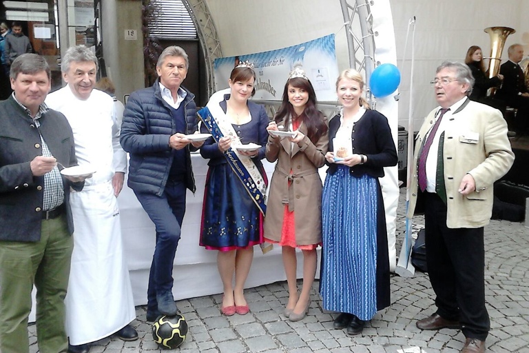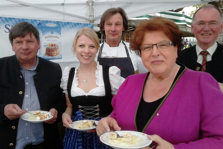 Auf dem Münchner Viktualienmarkt: Schrobenhausens Bürgermeister Karlheinz Stephan (von links), Katrin Nischwitz von der Schellermühle, Tantris-Koch Spoo, Landtagspräsidentin Barbara Stamm und Pfaffenhofens Vize-Landrat Anton Westner.