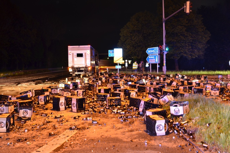 (ty) Heute Nacht gegen 3.30 Uhr war ein 42-Jähriger mit seinem Sattelzug in München auf dem Innsbrucker Ring in südwestlicher Richtung unterwegs; an der Kreuzung mit der Rosenheimer Straße wollte er bei Grün nach links in Richtung A8 abbiegen. Im Kurvenverlauf brach die vordere Verriegelungskralle der rechten Bordwand des Aufliegers. Hierdurch öffnete sich diese und ein Teil der Ladung, bestehend aus rund 250 Bierträgern, stürzte auf die Fahrbahn des Mittleren Rings.