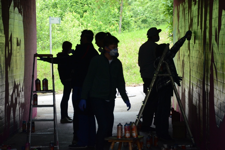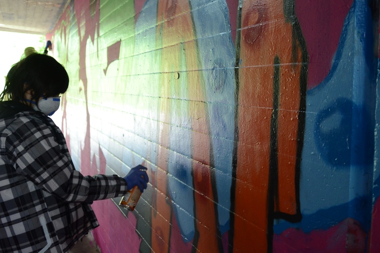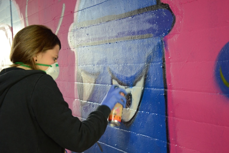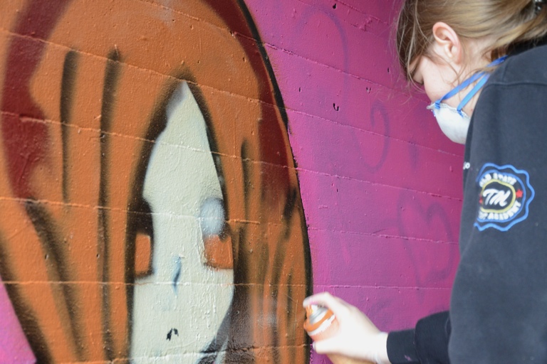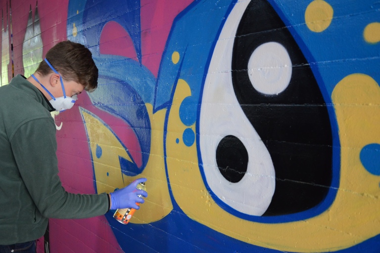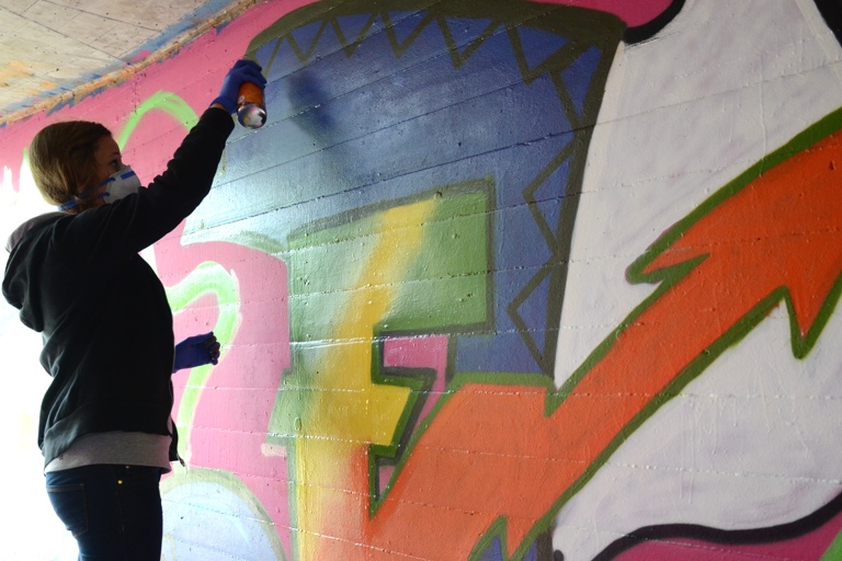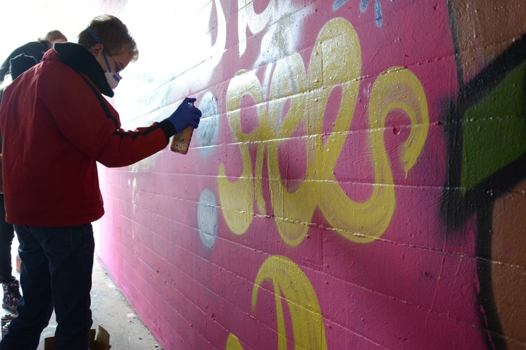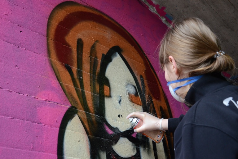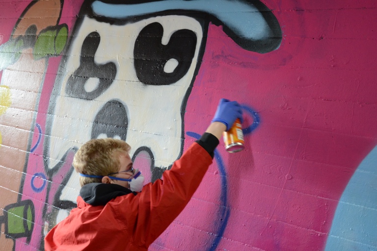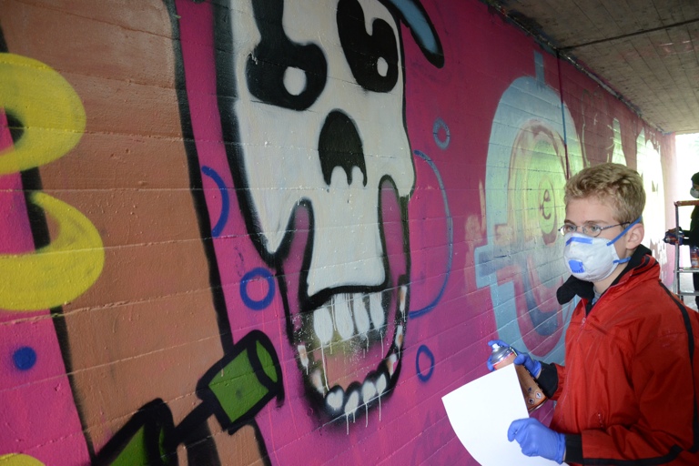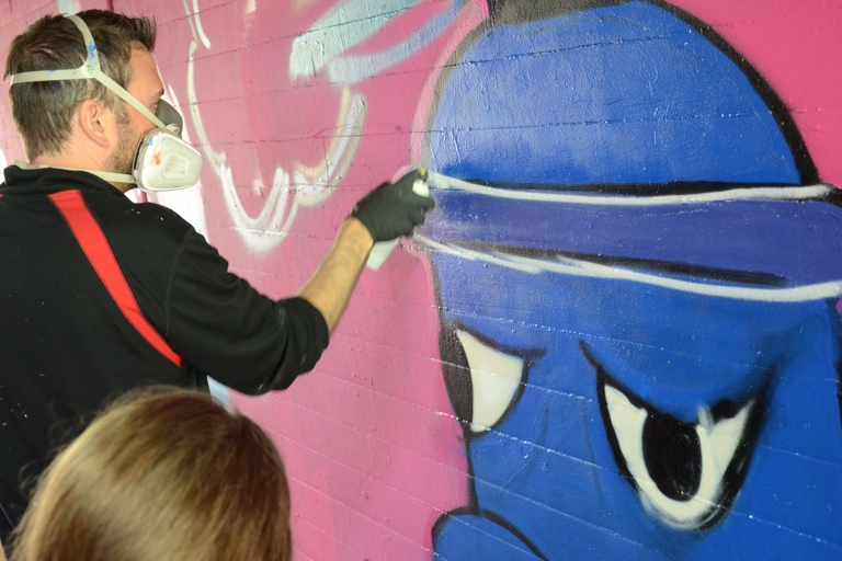 Unter der theoretischen und praktischen Anleitung von Andi Dill überlegten sich die Workshop-Teilnehmer gestern zunächst Motive und fertigten danach Skizzen von den geplanten Kunstwerken an. Dill, der selbst auf zahlreichen Flächen in der Stadt mit gesprühten Werken präsent ist, erklärte die Handhabung der Dosen, gab Tipps, verriet Tricks und erläuterte, worauf man achten muss beim Sprühen. Freilich trugen auch alle einen Mundschutz, damit die Farbdämpfe nicht eingeatmet werden.