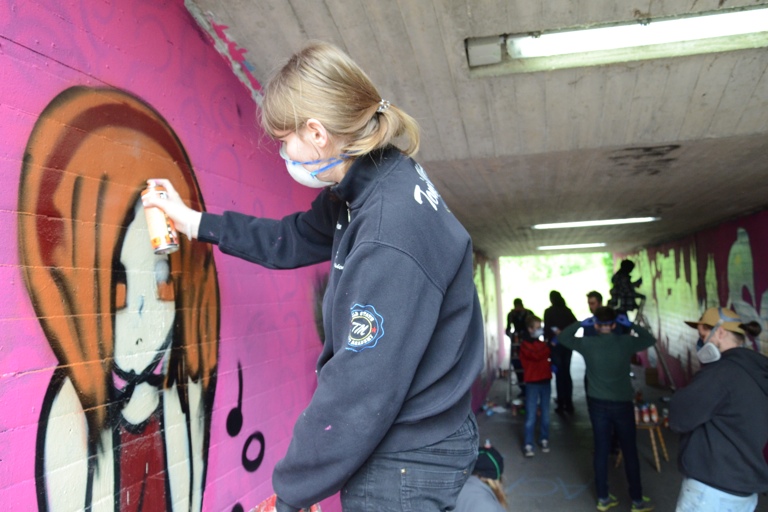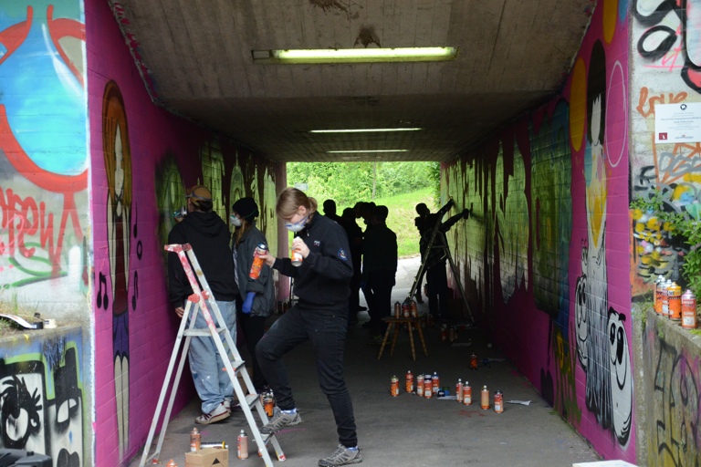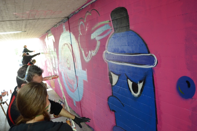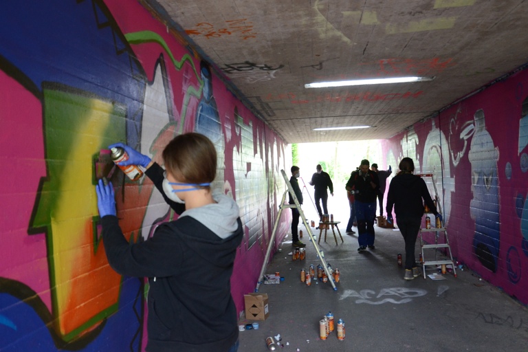 Platz, um sich auszutoben, hatten die Teilnehmer auch diesmal genug. Die Unterführung war zuvor gestrichen worden, damit die angehenden Sprayer freie Bahn hatten. Nicht nur hier, sondern auch in der Fußgänger-Unterführung in Niederscheyern und an der Mauer in den Hohenwarter Straße dürfen sich Graffiti-Künstler bekanntlich in der Kreisstadt ganz legal austoben. Allerdings sollte man sich in der Szene umhören, bevor man an der Hohenwarter Straße die Sprühdose zückt. Denn diese Fläche ist – ungeschriebenes Gesetz in der Szene – doch eher den erfahreneren Künstlern vorbehalten.