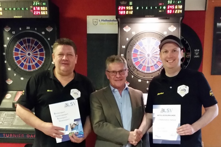 Der vor drei Jahren gegründete „1. Pfaffenhofener Dartclub e.V.“ hatte die Mitgliedschaft im Landes-Sportverband beantragt und wurde auch aufgenommen. BLSV-Kreischef Weiß gratulierte den Vereinsverantwortlichen und überreichte dem Vorsitzenden Markus Janner im Beisein von dessen Stellvertreter Michael Bolzer die offizielle Mitgliedsurkunde.