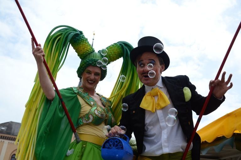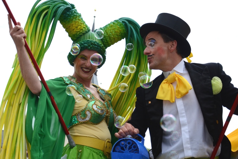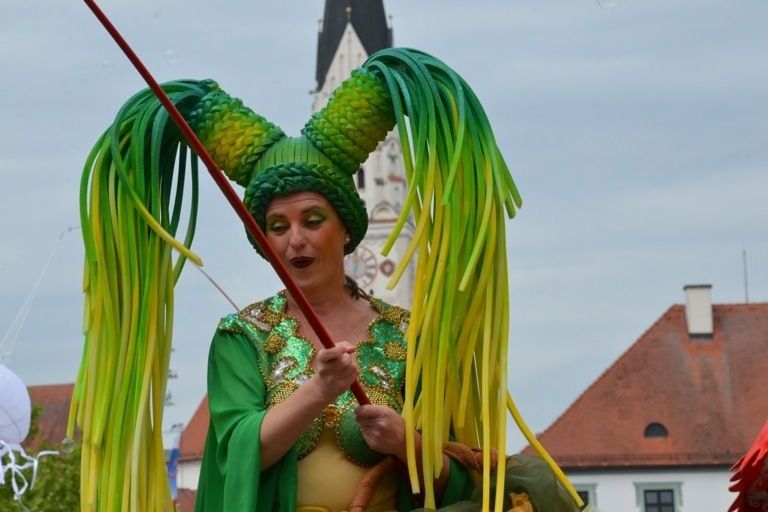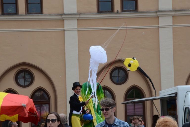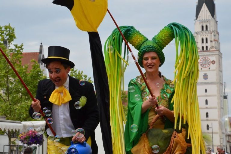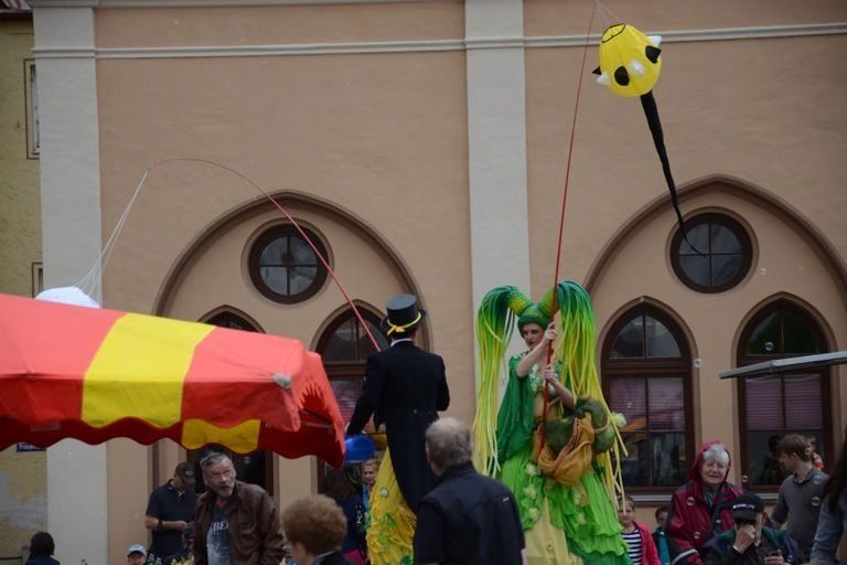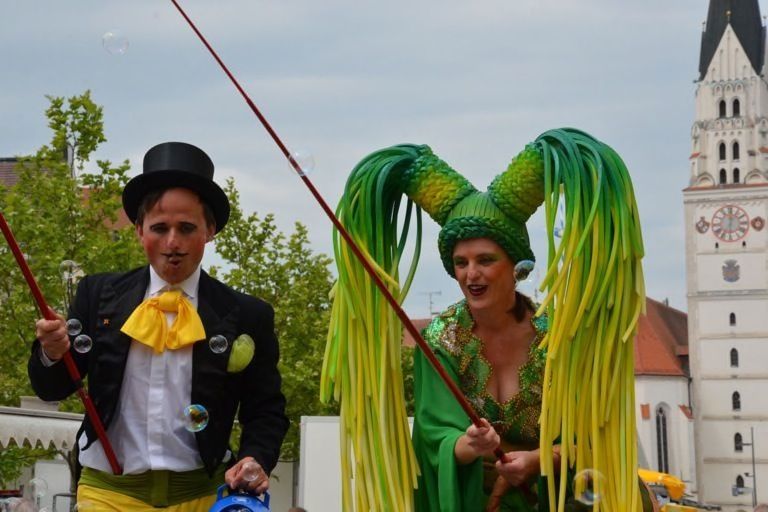 Die Pfaffenhofener Wirtschafts- und Servicegesellschaft (WSP) hatte die beiden Künstler erneut im Rahmen der Veranstaltungsreihe „Sommer in der Stadt“ engagiert, die in den kommenden Wochen jeweils am Samstagvormittag zusätzliche Attraktionen auf den Hauptplatz bringt. Und die zwei märchenhaften Stelzengeher sorgten heute für einen wahrlich gelungenen Auftakt. Nicht nur die Kinder bekamen große Augen, auch so mancher Erwachsene blickte fasziniert auf die beiden Paradiesvögel, die da über den Hauptplatz stelzten und die Leute unterhielten.