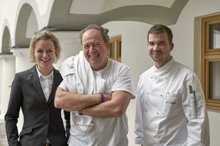 Wechsel in der Küche von Camers Schlossrestaurant: Der bisherige Küchenchef Fritz Schilling (Mitte) und sein Nachfolger Florian Vogel mit Serviceleiterin Iris Geier.