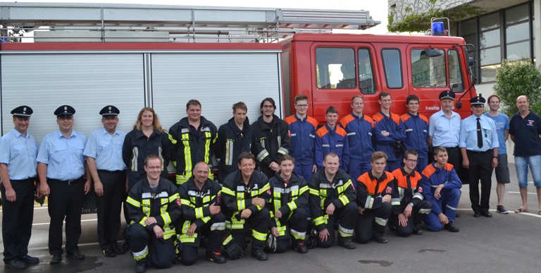 Gruppenfoto nach bestandener Prüfung: Kommandant Johann Rottler (hinten, von links), Schiedsrichter Christian Klotz und Michael Merus, Natalie Langer, Christoph Frömel, Korbinian Gschlößl, Armin Mooseder, Thomas Wittmann, Hubert Dietenhofer, Andre Langer, Dominik Spenger, Sebastian Pfliegler, Schiedsrichter Max Dennerlein, Vize-Kommandant Robert Weber, Ausbilder Richard Sorg und Michael Kahner sowie Stephan Rudnitzky (vorne, von links), Michael Eggl, Sebastian Müller, Jakob Guld, Fabian Ernstorfer, Michael Kuchenbuch, Tobias Mayr, Andreas Schmid.