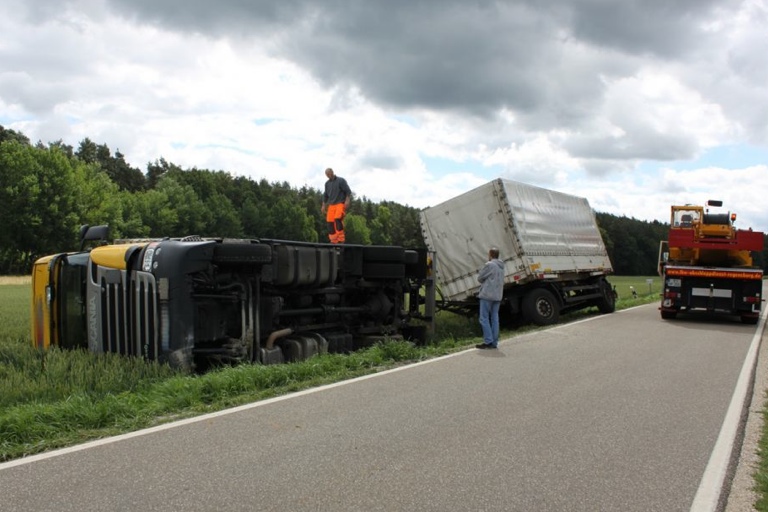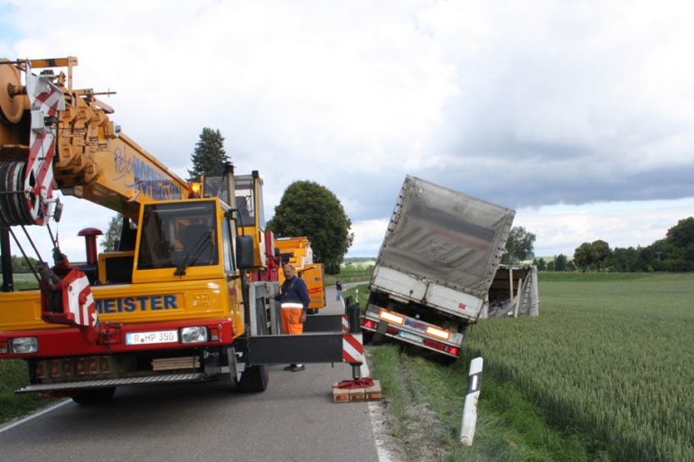 (ty) Die Feuerwehren von Langquaid und Herrngiersdorf mussten heute Vormittag kurz vor 11 Uhr ausrücken, weil auf der Kelheimer Kreisstraße 28 zwischen Niederleierndorf und Tiefenbach ein Lkw von der Fahrbahn abgekommen und in einer Wiese umgekippt war. Die Floriansjünger kümmerten sich um die nötige Vollsperrung der Straße in dem betroffenen Abschnitt und leiteten den Verkehr um. Zur Bergung des umgekippten Lasters musste ein Kran kommen. Gegen 13.45 Uhr war der Einsatz für die Feuerwehrler beendet. Weitere Informationen zu dem Unfall liegen derzeit noch nicht vor.