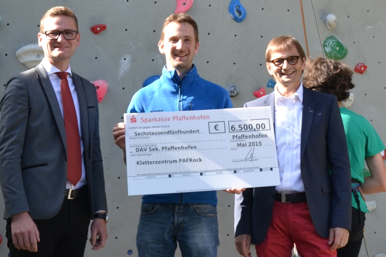 (ty) Auch in diesem Jahr unterstützt die Sparkasse Pfaffenhofen die Sektion Pfaffenhofen-Asch des Deutschen Alpenvereins. Der Vorsitzende Florian Brunthaler (Mitte) nahm den Scheck über 6500 Euro aus den Händen von Vorstandschef Norbert Lienhardt (rechts) Kundenbetreuer Benedikt Fuchs (links) entgegen. Das Geld wird zum einen für die neue Kletterhalle, im Speziellen für die Außengestaltung, und zum anderen für die Nachwuchsarbeit verwendet. (Foto: Rauscher)