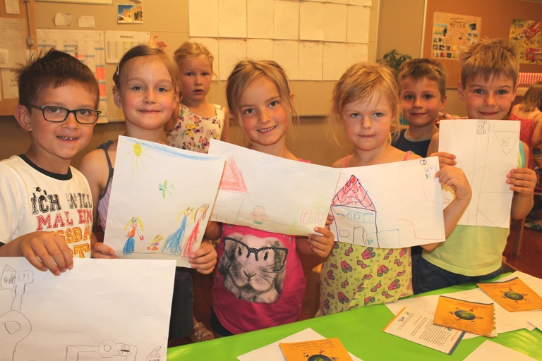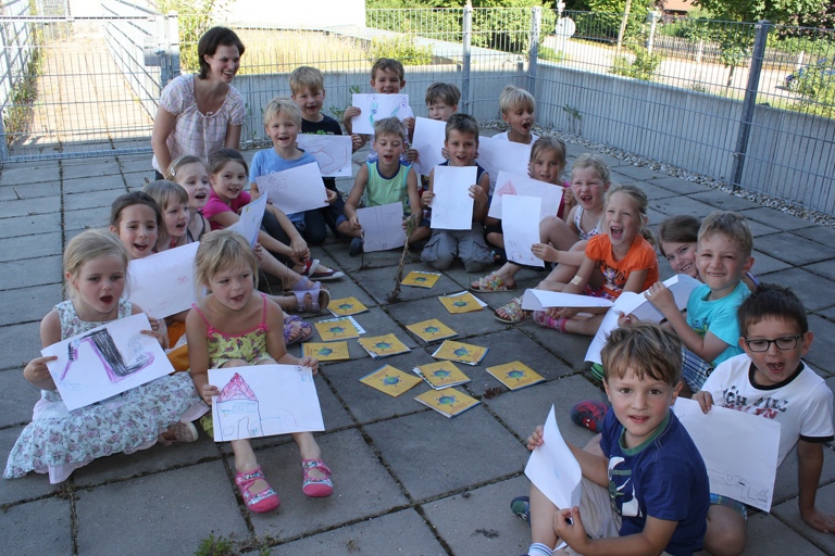 Die Vorschulkinder in der Kita Burzlbaam zeigen der städtischen Klimaschutzmanagerin Kathrin Merkert ihre bunten Bilder zum Thema „Mein Weg zur Kita“.