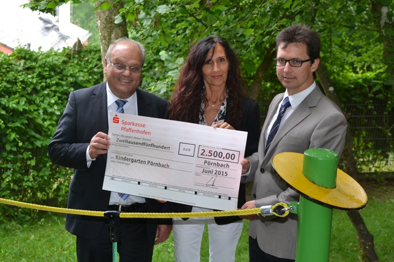 Die Sparkasse beteiligte sich finanziell an dieser Aktion mit 2500 Euro. Den Scheck dazu nahmen Bürgermeister Helmut Bergwinkel und die Leiterin des Kindergartens, Petra Mirlach, aus den Händen von Sparkassen-Vorstandsmitglied Stefan Maier entgegen.