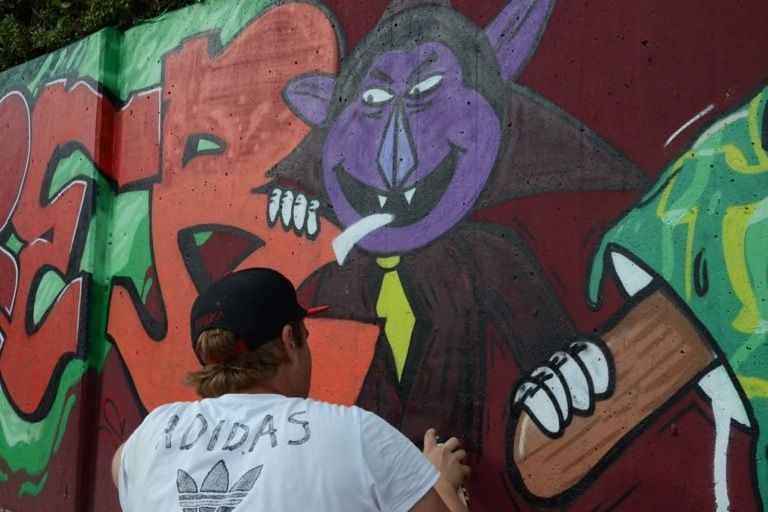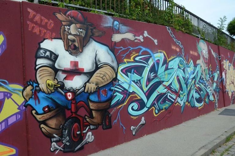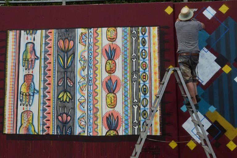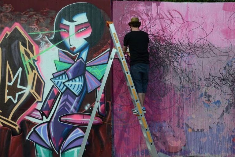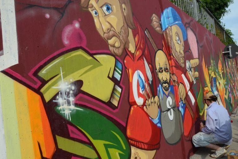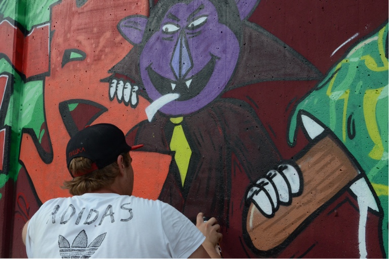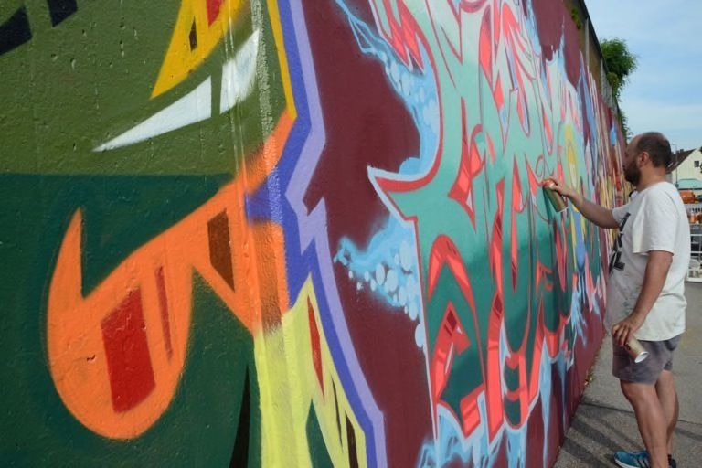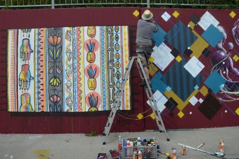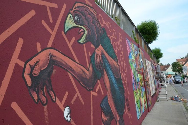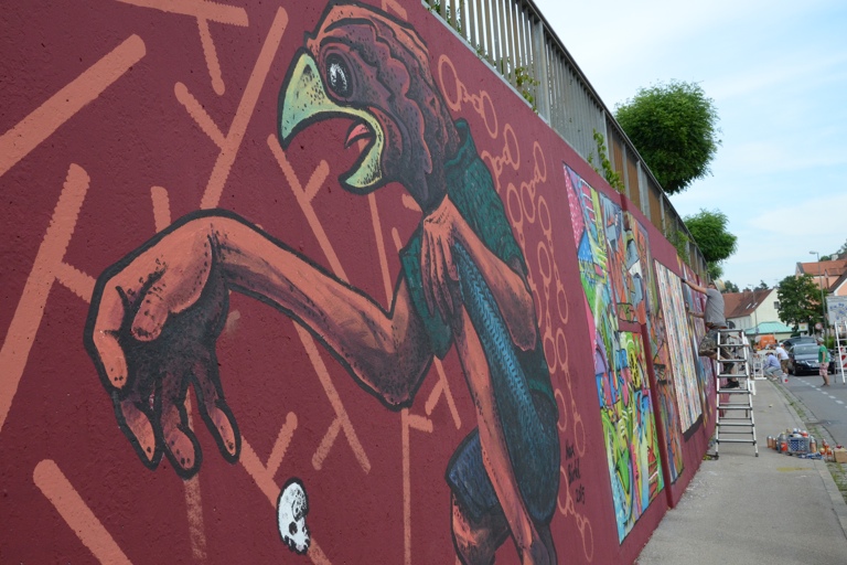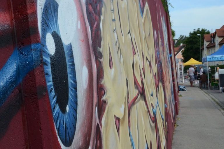 Heuer waren es nicht nur Graffiti-Maler, die ihre gewohnt bunten Motive auf die Wand an der Hohenwarter Straße brachten, sondern auch aus dem verwandten Bereich der Urban-Art waren einige Künstler am Start. Die großformatigen Motive entstanden dabei nicht nur mit Hilfe von Sprühdosen, auch Farbroller, der klassische Pinsel und manch recht eigenwillige, individuelle Technik kam da zum Einsatz.