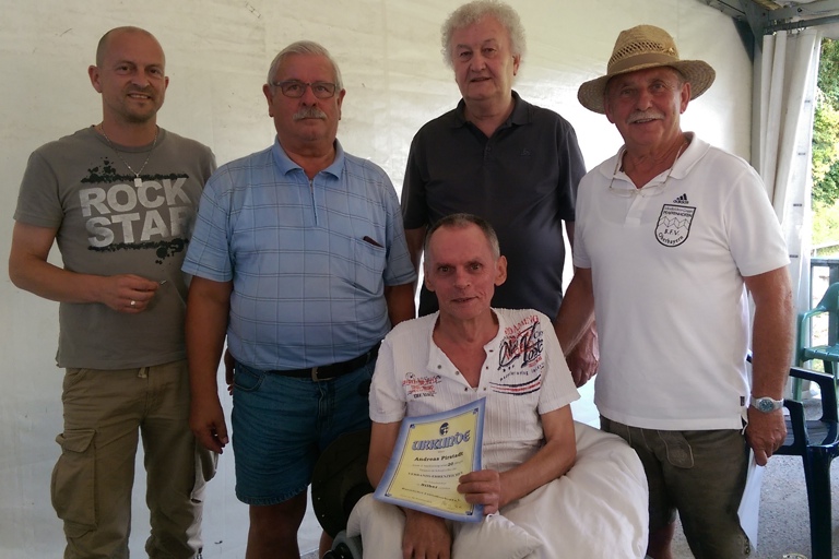 (ty) Im Rahmen ihres Sommerfests holte die Schiedsrichtergruppe Pfaffenhofen eine Ehrung nach, die aufgrund der schweren Erkrankung des Jubilars schon einige Zeit zurückgestellt werden musste: Andreas Pirstadt wurde für 20-jährige Mitgliedschaft in der Schiedsrichtergruppe Pfaffenhofen mit dem BFV-Verbandsehrenzeichen in Silber ausgezeichnet. Er war bis zu seiner Erkrankung eifrig als Unparteiischer unterwegs und hat sich stets in der Gemeinschaft der Schiedsrichtergruppe engagiert. Es gratulierten: Vize-Gruppenschiedsrichterobmann Michael Seidl (stehend von links), BFV-Kreischef Horst Kaindl, Kreisschiedsrichterobmann Willi Schneider und Gruppenschiedsrichterobmann Albert Schnell. (Foto: Wolfgang Inderwies)