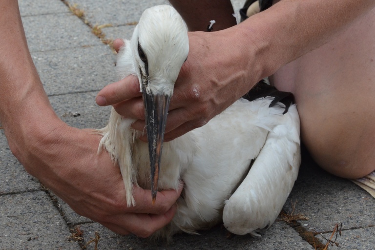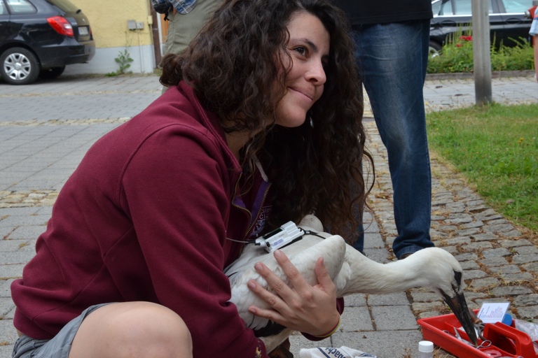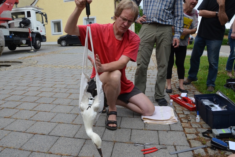 Dr. Wolfgang Fiedler vom Max-Planck-Institut für Ornithologie war heute eigens nach Reichertshofen gekommen, um dem Jungtier den Sender und den Datenlogger zu verpassen. Dazu wurde der Storch – man entschied sich für das kräftigste der drei Jungtiere – mit Hilfe einer Hebebühne aus dem Nest geholt und vor dem Rathaus dann am Boden mit der Technik ausgerüstet. Bei dieser Gelegenheit wurde das Tier auch gleich vermessen und gewogen. Zudem bekam es noch einen Ring mit einer Kennziffer – der sorgt dafür, dass der Storch leicht identifiziert werden kann, dafür reicht mitunter schon ein Fernglas. Außerdem musste der Vogel im wahrsten Sinne des Wortes zwei Federn lassen – die werden für eine genetische Untersuchung benötigt. Unterstützung bekam Experte Fiedler bei diesen Arbeitsschritten von einer wissenschaftlichen Mitarbeiterin aus Kolumbien, die derzeit in Deutschland Erfahrungen sammelt, um dann auch in ihrer Heimat Vögel „besendern“ zu können.