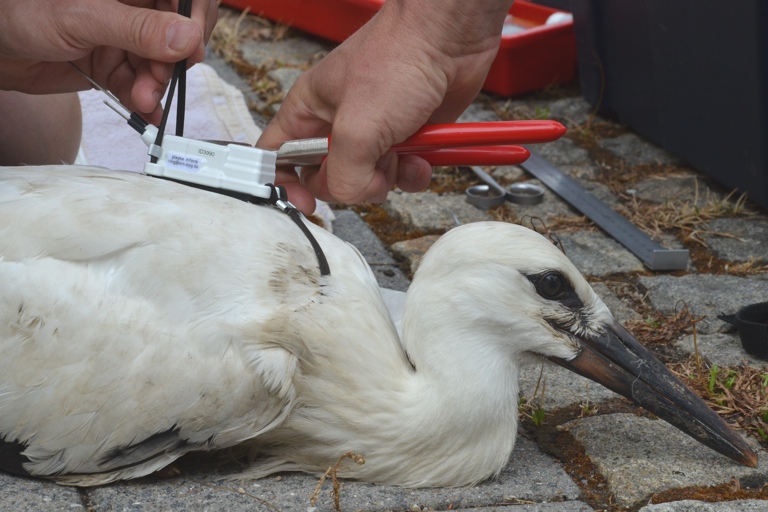 Eines der Reichertshofener Jungtiere ist heute mit Sender und Datenlogger ausgerüstet worden – Fachleute erhoffen sich dadurch neue Erkenntnisse über das Verhalten der Weißstörche – Über eine kostenlose App kann jeder mitverfolgen, wo sich die Tiere gerade herumtreiben