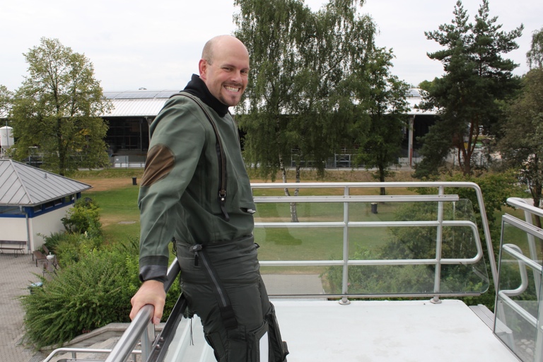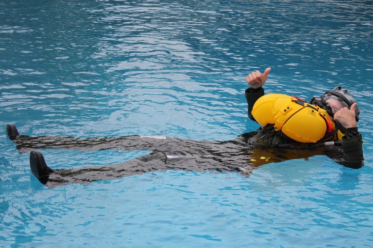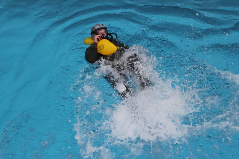 Ausgestattet unter anderem mit Fliegerjacke, Helmsystem und einem speziellen Kälteschutzanzug – inklusive Anti-G-Hose, die verhindern soll, dass dem Piloten beim freien Fall das Blut in die Füße absackt – sprang der Proband Stefan Klatt vom Fünf-Meter-Turm und schwamm anschließend eine Weile im Wasser. Um für seine Sicherheit zu sorgen, waren Rettungsschwimmer von der hiesigen Wasserwacht vor Ort. Ihr Einsatz war aber glücklicherweise nicht nötig, denn Klatts Equipment erfüllte seinen Dienst – und seine Haut blieb unter dem wasserabweisenden Anzug trocken.