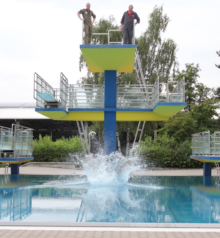 (ty) Eine Fallgeschwindigkeit von sieben Metern pro Sekunde und Wassertemperaturen von knapp über null Grad Celsius – um als Jet-Pilot der Bundeswehr einen Absturz über dem Ozean bei derartigen Bedingungen zu überleben, bedarf es spezieller Bekleidung. Um die Funktionsfähigkeit einer solchen Fliegersonderausrüstung zu erproben, hat sich die Wehrtechnische Dienststelle Manching jetzt in die Fluten des Pfaffenhofener Freibads gestürzt.