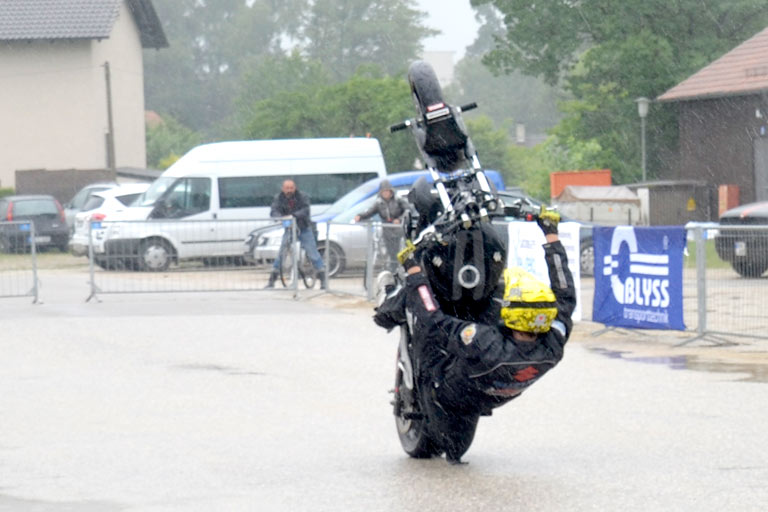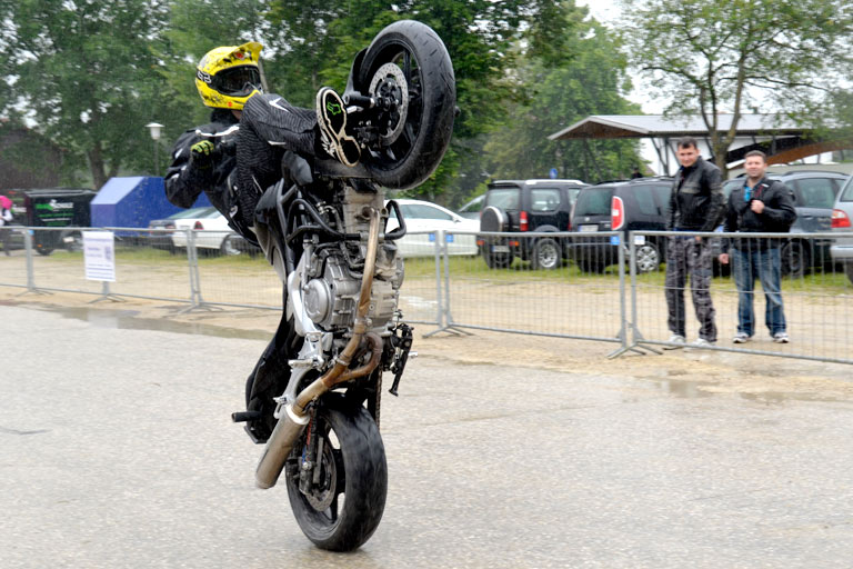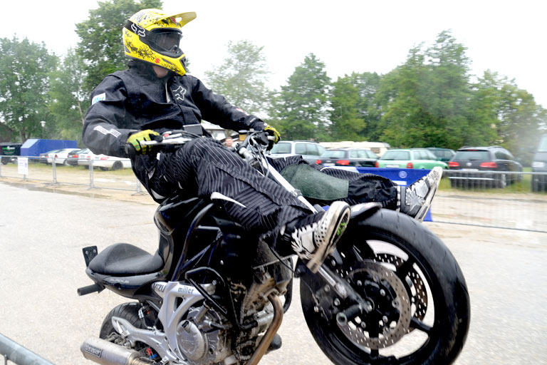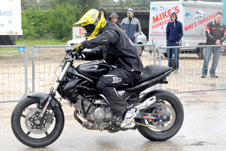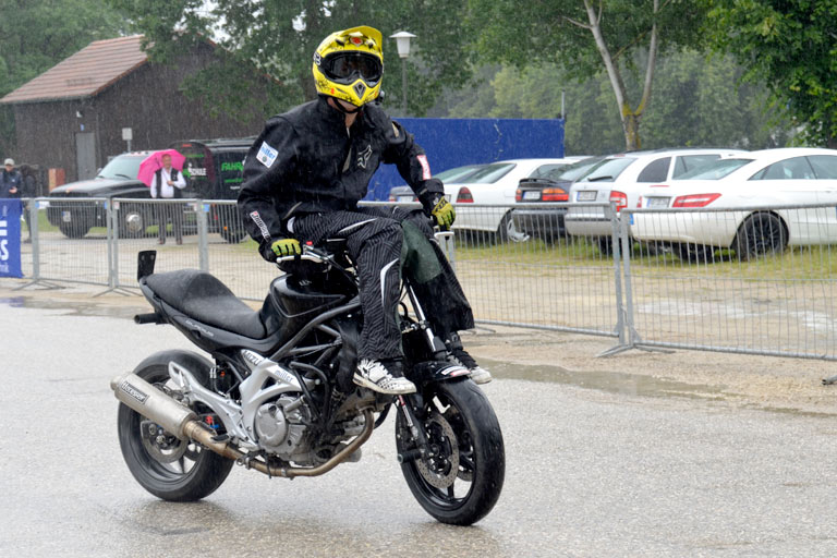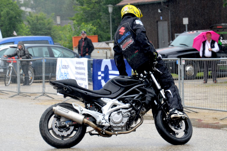 (kg) Vom schlechten Wetter ließen sich die Motorradfreunde am heutigen Samstag nicht abhalten. Trotz des Regens versammelte sich am Nachmittag eine Menschentraube vor der Paarhalle. Alle beobachten mit angehaltenem Atem die Ereignisse hinter der Absperrung. Denn dahinter, in der Showarea, befindet sich gerade Dominik Csauth – zusammen mit seiner Suzuki-Straßenmaschine. Doch Csauth sitzt nicht wie gewöhnlich im Sattel der Gladius 650, der 26-Jährige ist hauptberuflicher Stuntman. Mit waghalsigen, akrobatischen Stunts begeistert er sein Publikum. Er „surft“ beispielsweise auf nur einem Rad über den Asphalt und sitzt dabei auf der Lenkstange, macht einen Handstand, rollt sich ab und landet dabei wieder sicher im Sattel. „Da wäre eigentlich noch mehr gegangen“, erzählt er nach seiner halsbrecherischen Show, „aber heute ist es einfach zu nass.“ Dominik Csauth sitzt seit seinem sechsten Lebensjahr auf dem Bike. Der Allgäuer gehört zu Deutschlands renommiertesten Stuntfahrern, ist mehrfacher deutscher Meister und belegte bei der Europameisterschaft den dritten Platz.