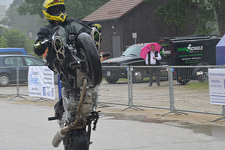 „Das Wetter hat uns heute leider nicht unbedingt in die Karten gespielt“, so der Initiator Mike Weber, „aber für Sonntag haben wir bestes Wetter bestellt, dann können auch alle Shows in vollem Umfang stattfinden.“ Am Sonntag geht es schon um 10 Uhr mit dem Bikerfrühshoppen los, anschließend lässt Stuntman Csauth seine Maschine steigen. Eine Erste-Hilfe-Vorführung der Johanniter zeigt allen Interessierten, wie man sich im Falle eines Motorradunfalls zu verhalten hat. Um 13.30 Uhr findet die traditionelle Motorradweihe statt. Und auch am Sonntag sorgen wieder verschiedene Bands für die musikalische Unterhaltung. Der Eintritt ist frei.