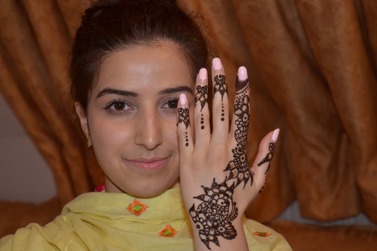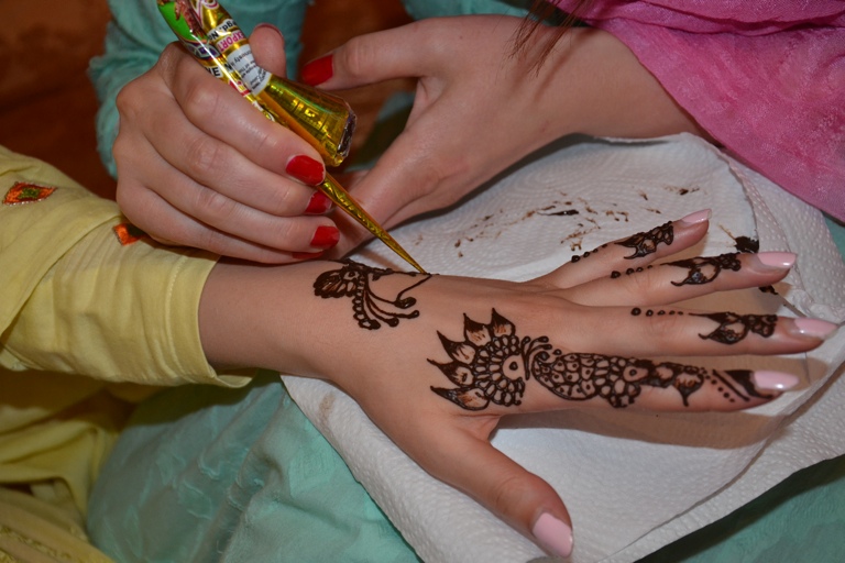 Vor allem in orientalischen Ländern, erzählt uns Matin, gehören für die Muslime nicht nur reichlich Süßigkeiten zum Ende des Ramadan, sondern auch Henna-Tattoos – übrigens auch für Männer. Diese Hautverzierungen, die nach einigen Tagen oder Wochen verblassen und schließlich wieder ganz verschwinden, bringt man sich gegenseitig an, kann sie sich aber auch selbst verpassen. Matins Tochter Rima bekam gestern ein filigranes Henna-Tattoo von ihrer Schwester Rohiya – mit bemerkenswert sicherer Hand, wie unsere Fotos belegen. Die spezielle Henna-Farbe wurde eigens aus Indien bestellt.