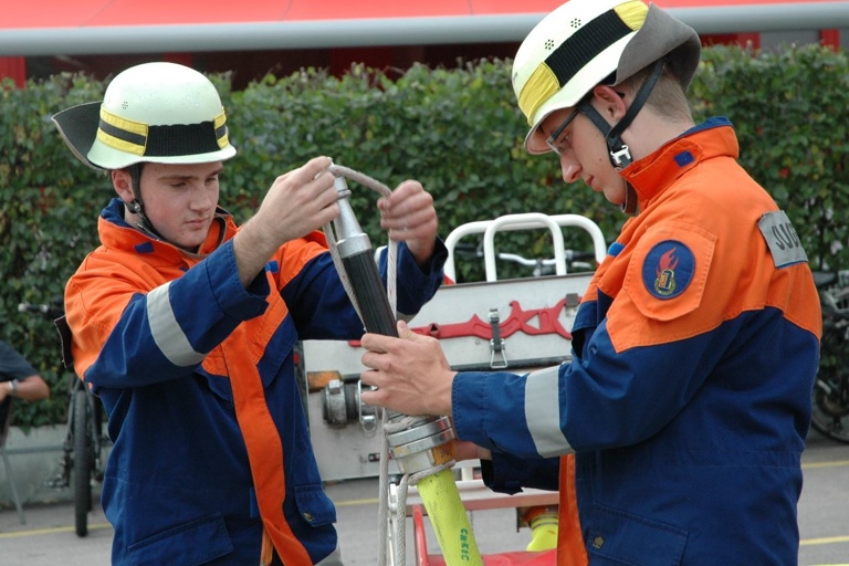 Zusätzlich zum Löschaufbau muss jede Gruppe bei der Leistungsprüfung vier Saugschläuche kuppeln. Mithilfe dieser Schläuche kann im Ernstfall über die Fahrzeugpumpe Wasser auch aus offenen Gewässern entnommen werden, erklärt Nischwitz. Des Weiteren musste jeder Prüfling einen bestimmten Knoten richtig ausführen können und – je nach Stufe – eine Zusatzaufgabe lösen. Dies waren in diesem Fall zum Beispiel Fahrzeugkunde oder das Erkennen von Gefahrenzeichen.