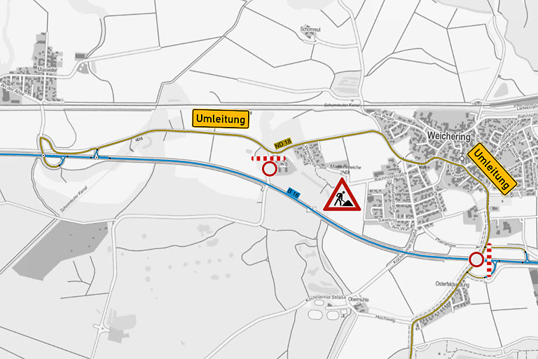 Die Arbeiten werden in zwei Bauphasen durchgeführt: Während der ersten Bauphase vom 29. bis 31. Juli erfolgt die Schadstellensanierung auf dem Abschnitt zwischen der Anschlussstelle Weichering und der Anschlussstelle Maxweiler unter halbseitiger Sperrung der Bundesstraße. Der Verkehr aus Richtung Ingolstadt wird über die Kreisstraße ND18 durch Weichering geleitet. Die Umleitungsstrecke ist ausgeschildert. Während der zweiten Bauphase am 5. und 6. August erfolgt die Fahrbahnsanierung zwischen der Anschlussstelle Maxweiler und der Zeller Kreuzung. Es gibt dann eine abschnittsweise halbseitige Sperrung der Bundesstraße, wobei der Verkehr mittels einer Ampel geregelt wird. Es ist mit zeitweiligen Verkehrsbehinderungen zu rechnen.