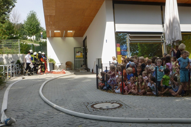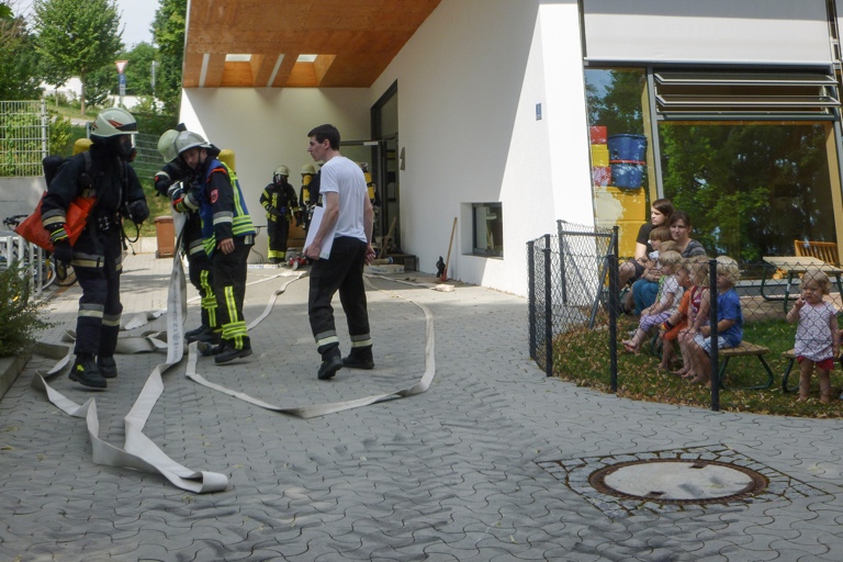 Die Feuerwehrler wiederum lernten im Zuge der Übung gleich mal den neu errichteten Kindergarten kennen und nutzten die Gelegenheit für eine Begehung. Die Buben und Mädchen verfolgten alles ebenso aufmerksam wie gespannt. Zum Abschluss wurde den Einsatzkräften eine Brotzeit spendiert.