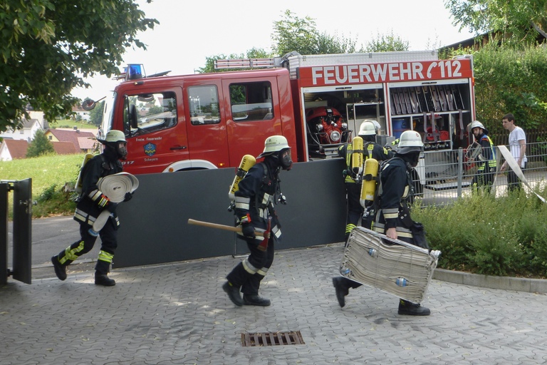 (ty) Heute wurde im Kindergarten St. Martin in Scheyern eine Feuerwehr-Übung unter realen Bedingungen abgehalten. Dazu wurde um 10 Uhr der Feueralarm ausgelöst und die hiesige Feuerwehr rückte mit drei Fahrzeugen und 17 Leuten an. Das fingierte Szenario: Zwei vermisste Personen im verrauchten Keller des Gebäudes. Die Floriansjünger gingen mit zwei Angriffstrupps zur Rettung vor. Insgesamt waren sechs Atemschutzgeräteträger in voller Montur im Einsatz.