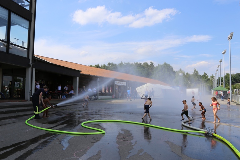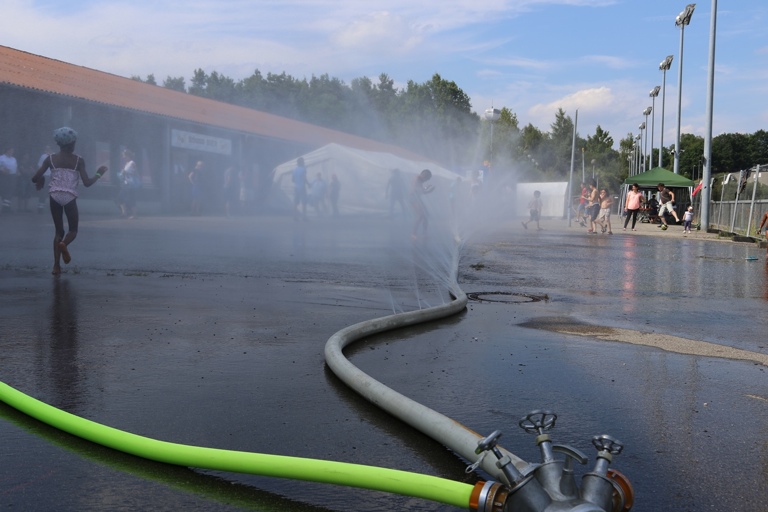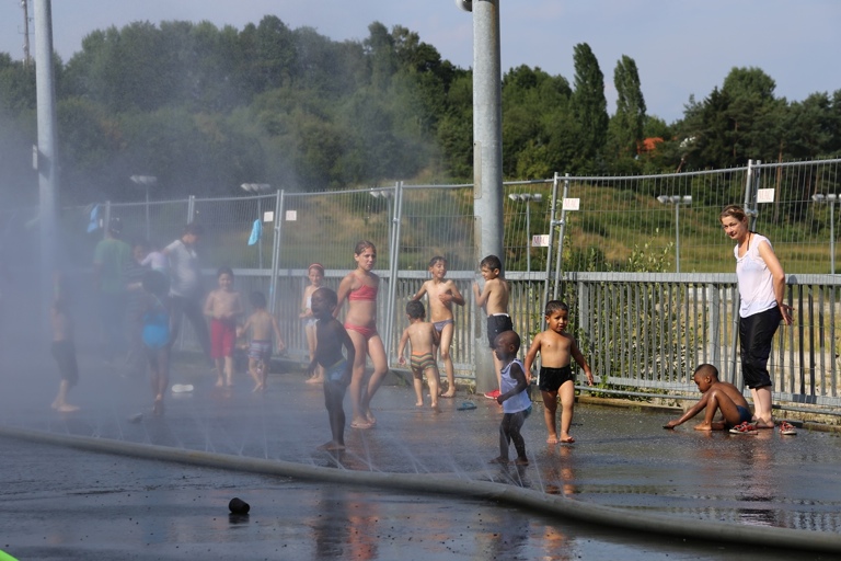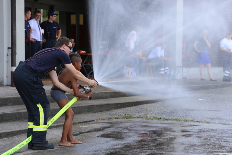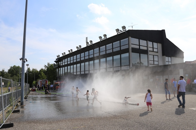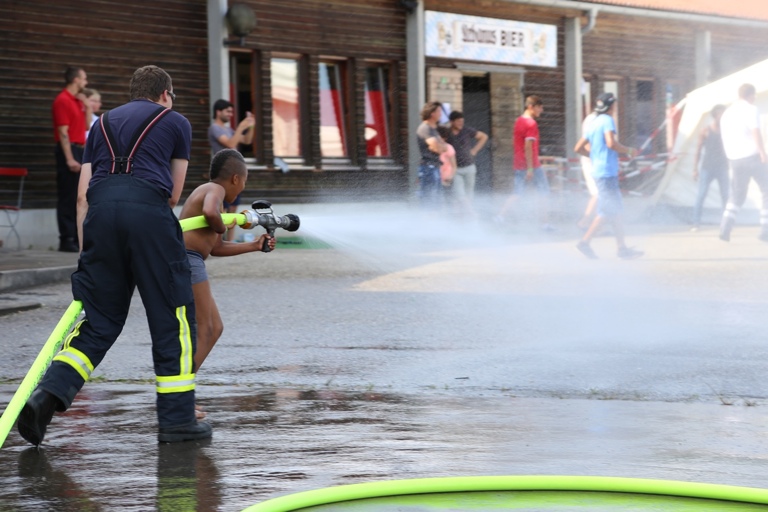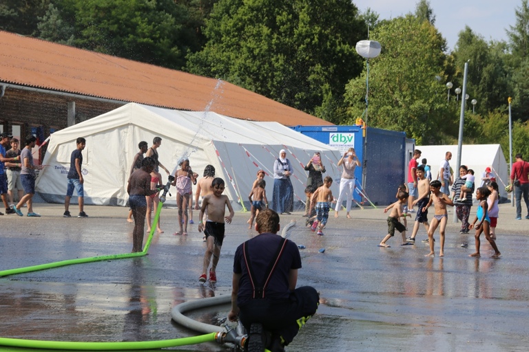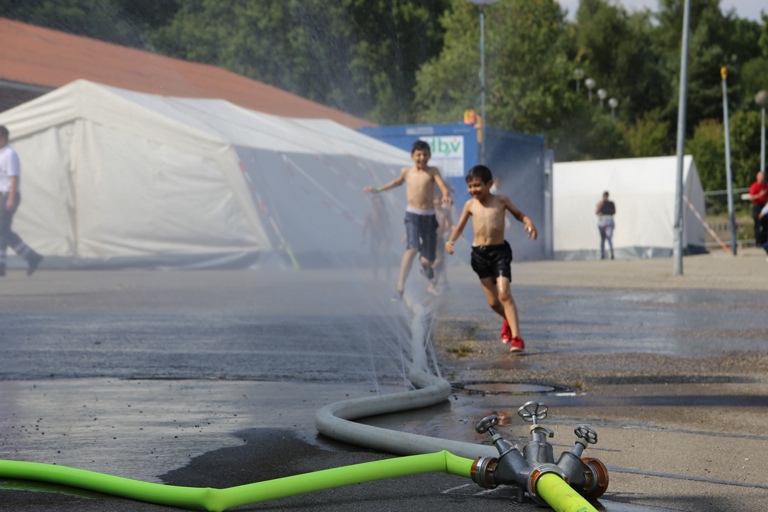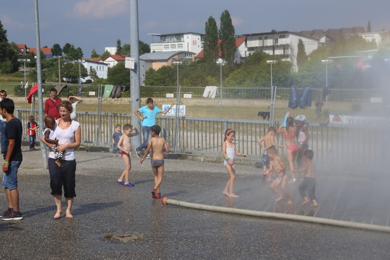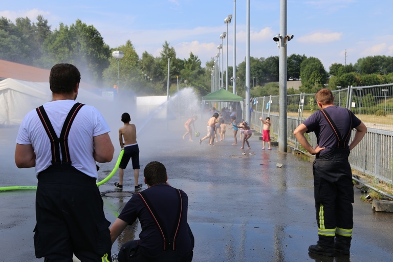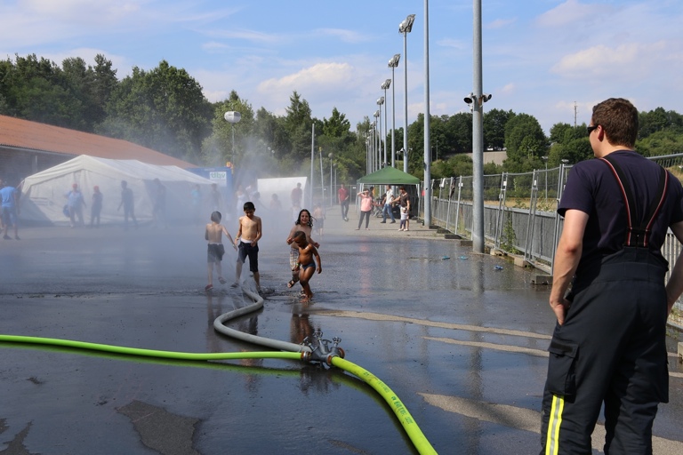 Und so staunten die Asylbewerber am Freitagnachmittag nicht schlecht, als plötzlich zwei Feuerwehrfahrzeuge auf den Hof fuhren und die Helfer damit begannen, Schläuche auszurollen. Als dann aus den Schläuchen fein verteiltes Wasser spritzte, gab es angesichts der tropischen Temperaturen für die Kinder kein Halten mehr: Sie hüpften munter durch das kühlende Nass. Auch den Erwachsenen war die Freude sichtlich anzusehen, als sie mit den gespendeten Fußbällen spielten und ebenfalls durch den Wassernebel liefen.