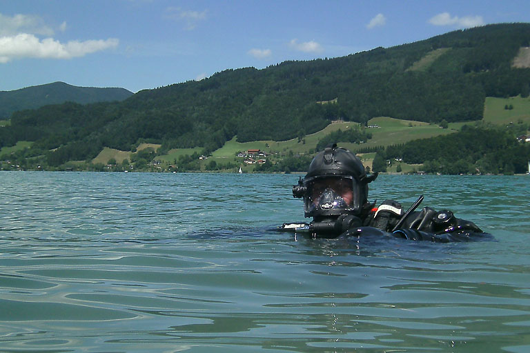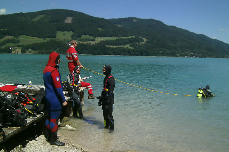 Am Sonntagmorgen ging es erneut zum Übungstauchen für die Rettungstaucheranwärter. Ziel war der Mondsee in Oberösterreich. Im Mondsee gibt es Übungsplattformen auf zehn und 17 Metern Tiefe. Hier wurde das Geschick der Anwärter im Umgang mit der Bügelsäge, dem Anlegen von Knoten unter Wasser aber und das Schrauben geübt. Unter Begleitung eines Tauchausbilders wurde auch das sichere Beherrschen der Ausrüstung in der maximalen Tauchtiefe für Rettungstaucher von 20 Metern geübt.