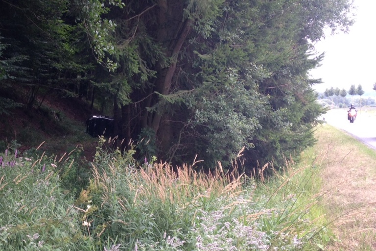 Von der Straße aus kaum zu sehen: Der schwarze Kleinwagen überschlug sich auf einer Lichtung und blieb auf der Fahrerseite liegen.