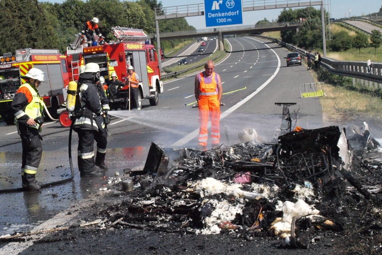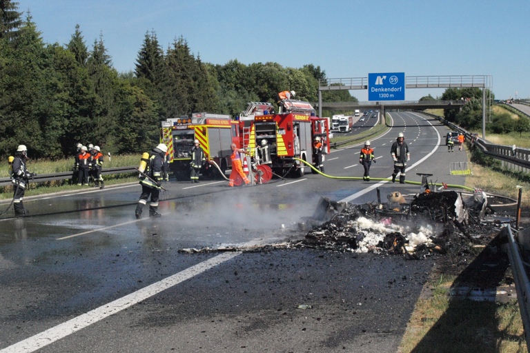 Er brannte heute Vormittag bei Denkendorf komplett nieder – für die Löscharbeiten mussten kurzzeitig alle Spuren in Richtung Norden gesperrt werden