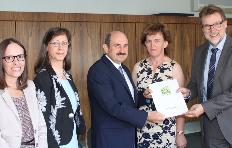 (ty) Im Rahmen des von der Staatsregierung sowie der Wirtschaft abgeschlossenen „Umweltpakts Bayern“ überreichte der Pfaffenhofener Landrat Martin Wolf (CSU) an den Geschäftsführer der Reichertshofener Firma Concept-GmbH, Adam Wolf, die entsprechende Urkunde. Das Unternehmen hat sich zu einer qualifizierten, freiwilligen Umweltleistung verpflichtet und wurde somit vom Ministerium für Umwelt, Gesundheit und Verbraucherschutz als Teilnehmer bestätigt. Wolf dankte den Firmenvertretern für ihren Beitrag zum Erhalt der natürlichen Ressourcen: „Ihr Engagement unterstützt unseren Politikansatz ‚Freiwilligkeit vor Ordnungspolitik´.“ Die Concept-GmbH wartet Bürotechnik wie Drucker und Kopiergeräte und rüstet diese um auf Feinstaub- und Stromeinsparung.