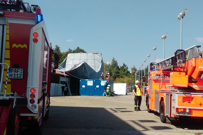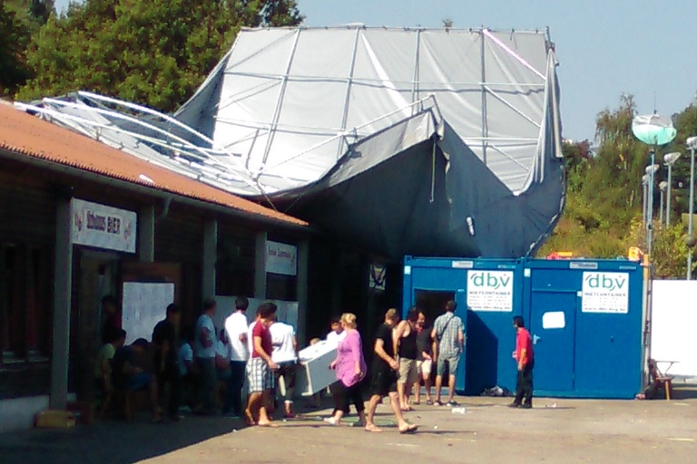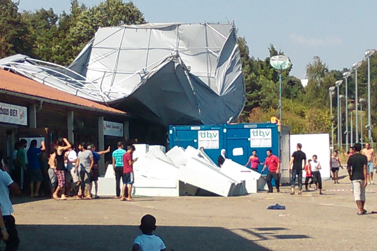 Gegen 16 Uhr zeigte die Natur kurz ihre Macht. Gebildet haben soll sich die Windhose im Innenraum der stillgelegten Rennbahn; sie näherte sich dann unaufhaltsam den Gebäuden. Vor der Festhalle, wo die Asylbewerber einquartiert sind, stand die Zeltkonstruktion. Dort waren zahlreiche Spinde untergebracht, in denen die Flüchtlinge ihre persönlichen Gegenstände verwahren können. Der Wind fuhr jedenfalls so heftig in das Zelt, dass es aus der Verankerung gehoben und – verkehrt herum – auf das Dach der Halle geschmissen wurde. Spinde fielen um. Nicht auszudenken, wenn da jemand dazwischengeraten wäre.