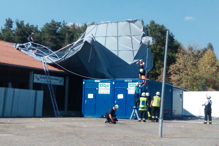 Von ehrenamtlichen Helfern, die gerade vor Ort waren, wurde die Pfaffenhofener Feuerwehr gerufen, während Hausmeister und Security sich versicherten, dass niemand von den umgefallenen Spinden begraben oder sonst irgendwie verletzt worden war. Die angerückten Floriansjünger kümmerte sich dann – im Gegensatz zu manchen Laien, die zuvor ungesichert herumgekraxelt waren – fachmännisch um die Bergung des Zelts und bannten die Gefahr.