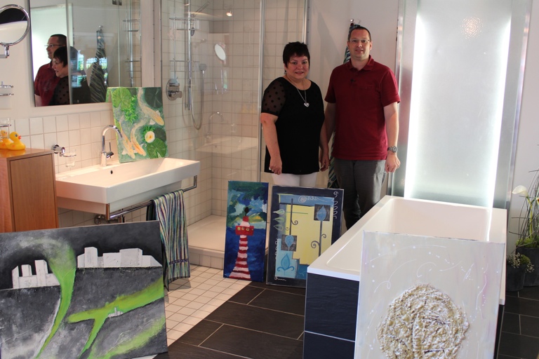 Petra Dockendorf, die Leiterin des „Bunt-Zeit“-Ateliers und Kunsttherapeutin, bietet immer wieder Seminare für Einzelpersonen oder kleine Gruppen an. Hobbykünstler aller Altersklassen finden so eine Plattform, um unter fachkundiger Anleitung ihrer Kreativität freien Lauf lassen zu können. „Nur was nützt es, wenn die teils sehr beeindruckenden Werke niemand zu Gesicht bekommt?“, fragte sich Dockendorf. Und so entstand die Idee, freie Wandflächen in den Muster-Bädern und in weiteren Ausstellungsräumen bei der Firma Götz zu nutzen, um dort einige der Kunstwerke zu präsentieren.