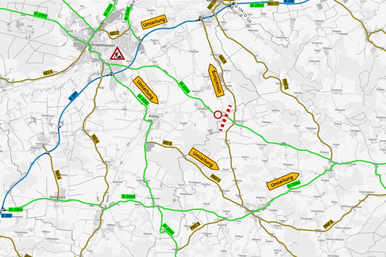 Eine örtliche Umleitung in Richtung Pfaffenhofen über Aresing und Gerolsbach nach Euernbach wird eingerichtet. In Richtung Schrobenhausen erfolgt die Umleitung ab Strobenried über Waidhofen und die B 300. Da die Bundesstraße ab Waidhofen als Kraftfahrtstraße gewidmet ist, wird der landwirtschaftliche Verkehr ab Waidhofen über die parallel zur B 300 verlaufende Gemeindeverbindungsstraße nach Schrobenhausen/Mühlried umgeleitet.