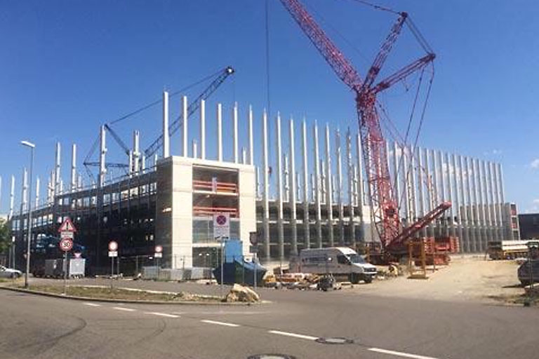 Das Parkhaus an der Rasmussenstraße wird gerade um fünf zusätzliche Ebenen aufgestockt, um den 5500 Beschäftigten im GVZ auch weiterhin ausreichend Parkraum anzubieten. Nach der Fertigstellung, voraussichtlich im November, wird es auf insgesamt sieben Ebenen Platz für 1680 Autos geben.