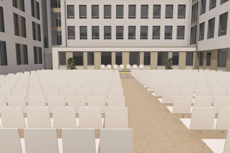 Diese Grafik zeigt die temporäre Innenhof-Bestuhlung aus Sicht des Besuchers.