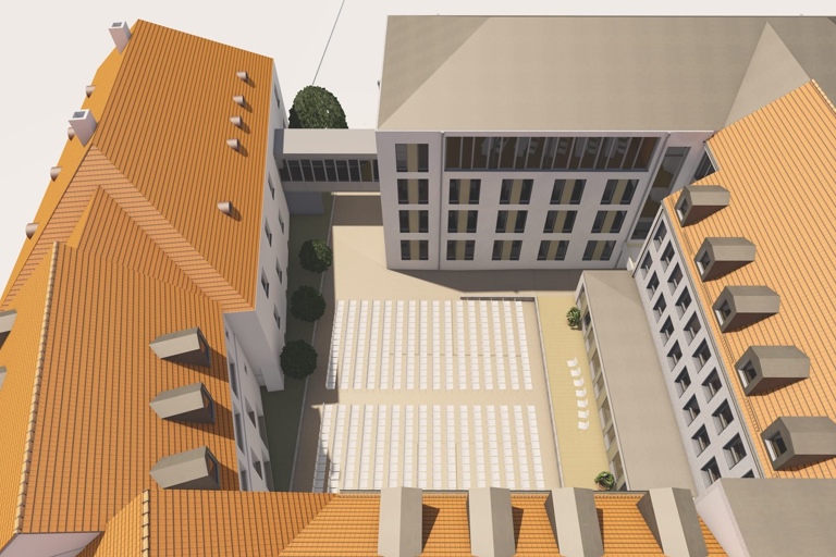 Der Innenhof des Pfaffenhofener Landratsamts wird nicht autofrei – denn wichtigen Leuten will man nicht zumuten, dass sie ihren Pkw im Parkhaus abstellen und über die Straße gehen. Abends und an Wochenenden sind aber Veranstaltungen mit Bühne und über 430 Sitzplätzen möglich