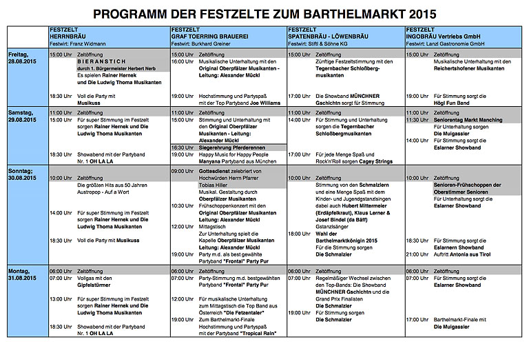 (ty) Bestes Wetter wird für den diesjährigen Barthelmarkt in Oberstimm erwartet. Auftakt ist heute Nachmittag. Bei viel Sonne und hochsommerlichen Temperaturen bietet der legendäre Barthelmarkt bis einschließlich Montag, 31. August, ein umfangreiches Programm und viele Highlights und wird wie in jedem Jahr Hundertausende auf die Festwiese locken.