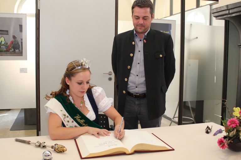 Anna Roßmeier folgte dieser Einladung freilich gerne. Es gab einen kleinen Empfang im Foyer des Rathauses, an dem auch eine Reihe von Stadträten sowie die noch amtierende Volksfestkönigin 2014, Julia Eichinger, teilnahmen. Herker zeigte sich hoch erfreut, dass nach fünf Jahren wieder eine Pfaffenhofenerin auf dem Hallertauer Hopfenthron sitzt. Anna Roßmeier, die auf dem elterlichen Hof wohnt und bei der Hallertauer Volksbank arbeitet, bezeichnete es als besondere Ehre, sich ins Goldene Buch ihrer Heimatstadt eintragen zu dürfen. Ihre Unterschrift leistete sie im wahrsten Sinne des Wortes mit Links – denn sie ist Linkshänderin – und sie fügte ihrem Namen auch noch den Spruch „Hopfen und Malz, Gott erhalt’s!“ hinzu.