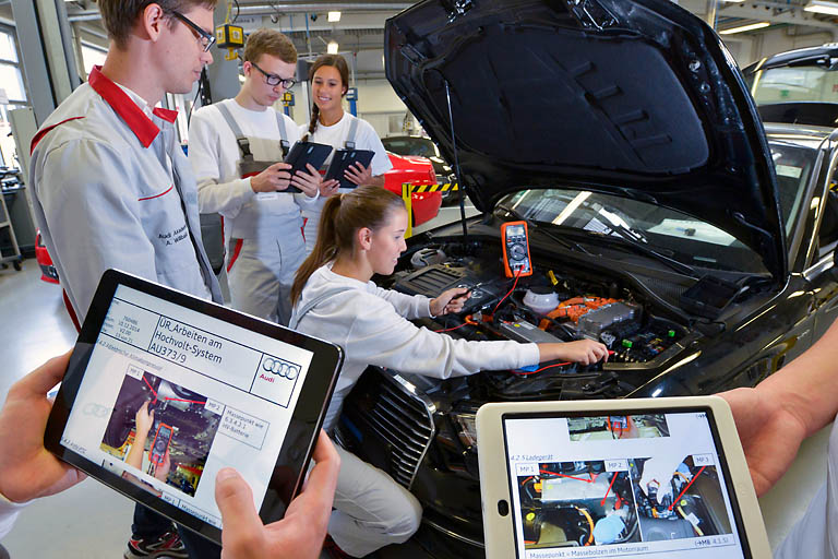 Mit dem Konzept „Mobile Learning“ fördert Audi nicht nur Eigenverantwortung und Kreativität der jungen Leute, sondern legt auch einen besonderen Schwerpunkt auf IT‑ und Medien-Kompetenz. Mithilfe von Tablet‑Computern können die Auszubildenden Wissen zeit‑ und ortsunabhängig genau dann abrufen, wenn sie es brauchen. Gelernt wird allein oder in kleinen Lerngruppen, standortunabhängig und international vernetzt. Schon die Pilotphase des Projekts hat gezeigt: Das neue Konzept steigert Motivation und Lernerfolg der Azubis. „Wir gehen mit diesen hochmodernen, effizienten und begeisternden Lern‑ und Lehrmethoden völlig neue Wege und schaffen so schon heute die personellen Grundlagen für die digitale Zukunft“, sagt Thomas Sigi, Personalvorstand und Arbeitsdirektor, „wir werden diese Art der Berufsausbildung 2.0 im Sinne der ‚Generation Z‘ weiter konsequent ausbauen."
