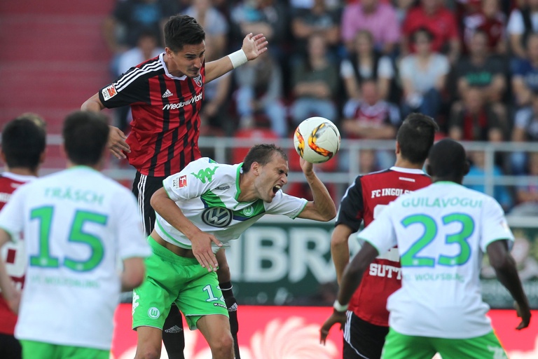 Auch in der 25. Minute war Leckie nur irregulär stoppen, sonst wäre er in den VfL-Strafraum eingedrungen und hätte wieder für eine gefährliche Situation gesorgt. Spätestens jetzt hatten die Schanzer die Gäste da, wo sie sie haben wollten: Im In-Fight um jeden Ball. Immer wieder musste Wolfsburg robust einsteigen, um die Ingolstädter Renner zu stoppen. So langte André Schürrle zwei Mal ordentlich hin und nach einem rüden Einsteigen gegen Roger sah auch VfL-Neuzugang Josuha Guilavogui die gelbe Karte.