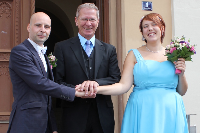 (ty) Seine erste Trauung vollzog jetzt Pfaffenhofens Dritter Bürgermeister Roland Dörfler: Die Braut ist, ebenso wie Dörfler, eine stadtbekannte „Grüne“: Eva Schratt, Ortsvorsitzende der Pfaffenhofener Grünen und Tochter der früheren Dritten Bürgermeisterin Monika Schratt, gab ihrem Auserwählten, Steffen Benz, das Ja-Wort und heißt nun Eva Benz. „Ich war schon ganz schön nervös“, gestand Dörfler nach der Trauung im Festsaal des Pfaffenhofener Rathauses. Er hatte sich aber bestens vorbereitet und machte seine Sache sehr gut: „Ich habe natürlich vorher bei Bürgermeister Thomas Herker und unseren Standesbeamtinnen, Frau Moll und Frau Reisner, hospitiert.“ Und weil er wusste, dass die Beatles die Lieblingsband des Brautpaars sind, stellte er die Zeremonie unter das Motto „All you need is love“. Wie sich das Brautpaar kennengelernt hat, ist übrigens auch eine spannende Geschichte...