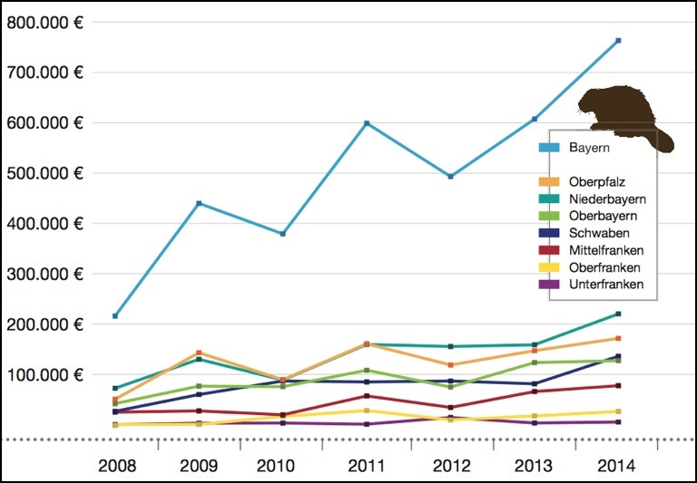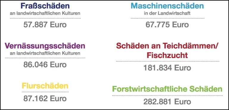 Der Biber hinterlässt Fraßschäden in Mais- und Getreidebeständen, er sorgt für überschwemmte Acker- und Wiesenflächen. Schlepper brechen ein, weil Wiesen, Äcker und Wege unterhöhlt werden. Die Schäden nehmen zu: Allein im vergangenen Jahr wurden über 700 000 Euro an Schäden in der bayerischen Land-, Forst- und Teichwirtschaft von den Naturschutzbehörden bestätigt, wie heute erklärt wurde. Hier eine Übersicht des Bayerischen Bauernverbands zu den offiziell anerkannten Schäden, die durch Biber im Freistaat beziehungsweise in den Regierungsbezirken in den vergangenen Jahren angerichtet wurden.