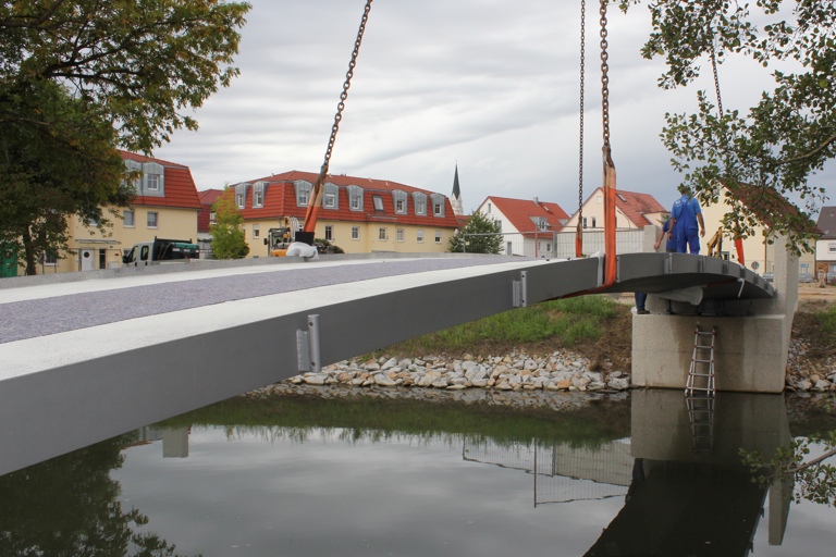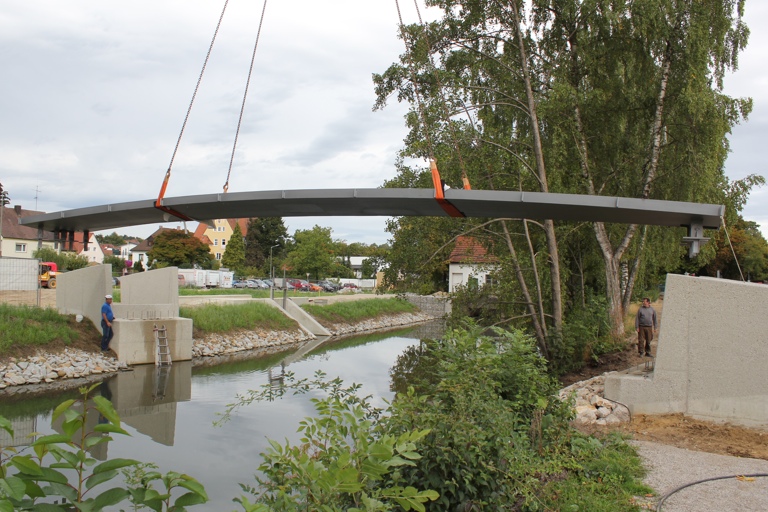Der Einhub der fertigen Brücke mit Hilfe eines großen Krans in die bereits installierten Stahlbeton-Widerlager war heute Vormittag ein nicht alltägliches Schauspiel und wurde deshalb nicht nur von den Planern aus München, sondern auch von Schaulustigen aufmerksam beobachtet. „Letztlich waren dann alle sehr zufrieden mit der präzisen Arbeit und den passgenauen Teilen“, sagt eine Sprecherin der Stadtverwaltung.