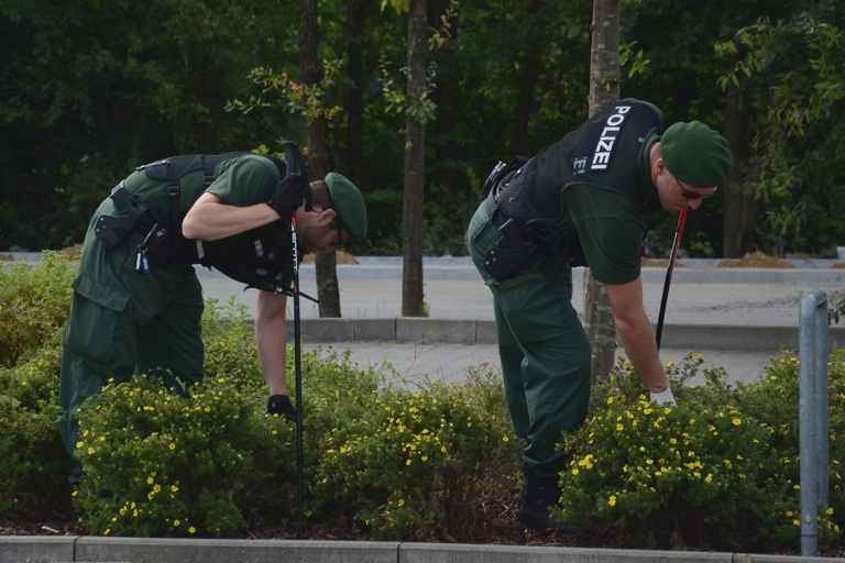 Kräfte der Bereitschaftspolizei suchen die Umgebung nach der Tatwaffe ab.