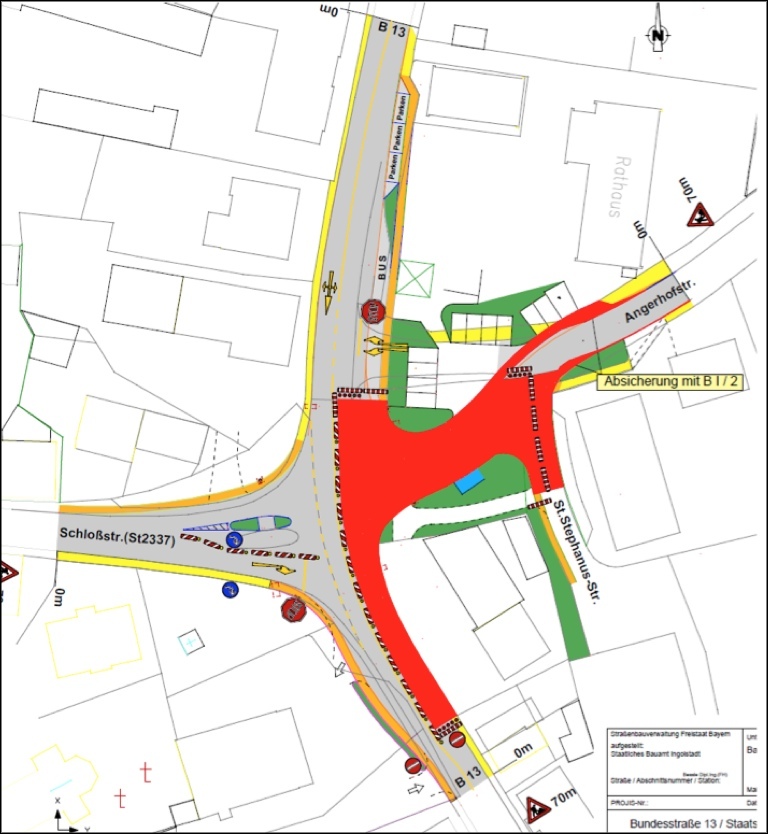 (ty) Im Zuge des Umbaus der Kreuzung von Bundesstraße 13 und Staatsstraße 2337 in der Ortsmitte von Reichertshausen muss die B 13 (Pfaffenhofener Straße und Münchner Straße) ab dem morgigen Montag und voraussichtlich bis Ende November halbseitig gesperrt werden. Der Bundesstraßenverkehr wird hierzu in Fahrtrichtung Norden (von München kommend in Richtung Pfaffenhofen) über die Autobahn A9 umgeleitet. In Fahrtrichtung Süden (von Pfaffenhofen kommend in Richtung München) bleibt die B 13 weiterhin befahrbar, wie das Staatliche Bauamt Ingolstadt mitteilt.