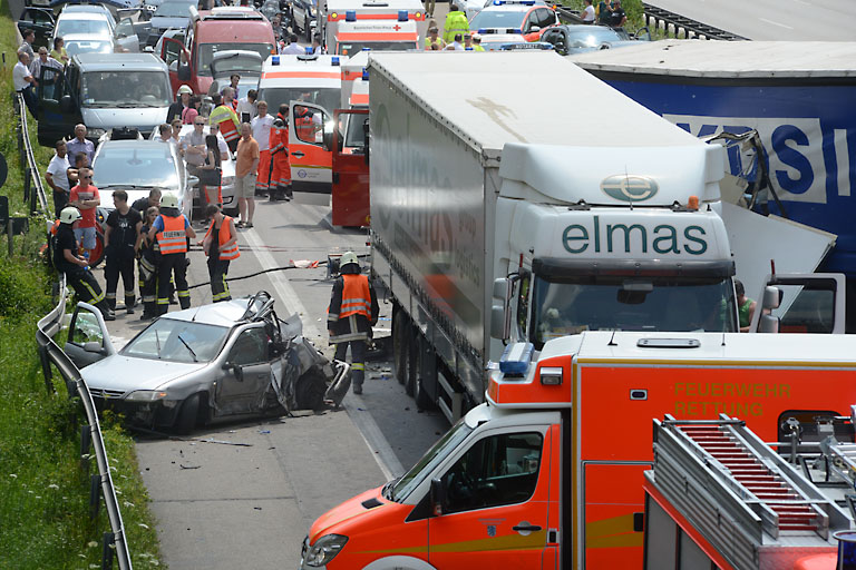 (ty) Gegen 12.10 Uhr befuhr ein 45-jähriger Lkw-Fahrer den rechten Fahrstreifen der Autobahn in Fahrtrichtung Nürnberg. Etwa einen Kilometer vor der Anschlussstelle Ingolstadt-Süd kam es zu Stauungen auf den drei Fahrstreifen. Aufgrund momentaner Unachtsamkeit erkannte der 45-jährige Fahrer aus Rumänien das Stauende zu spät und lenkte seinen unbeladenen Sattelzug nach links. Trotz einer Vollbremsung erfasste der Lkw-Fahrer einen Kleintransporter. Der Kleintransporter wurde in Folge des Aufpralls auf den Pkw eines 63-jährigen geschleudert. Dieser Pkw wurde dadurch nach rechts auf den Standstreifen geschleudert und kam an der rechten Leitplanke zum Stehen. Aufgrund des massiven Aufpralls schleuderte der Kleintransporter weiter in Fahrtrichtung und prallte noch frontal auf des Heck eines auf dem rechten Fahrstreifen stehenden Lkw.